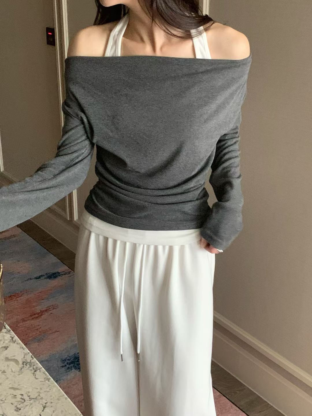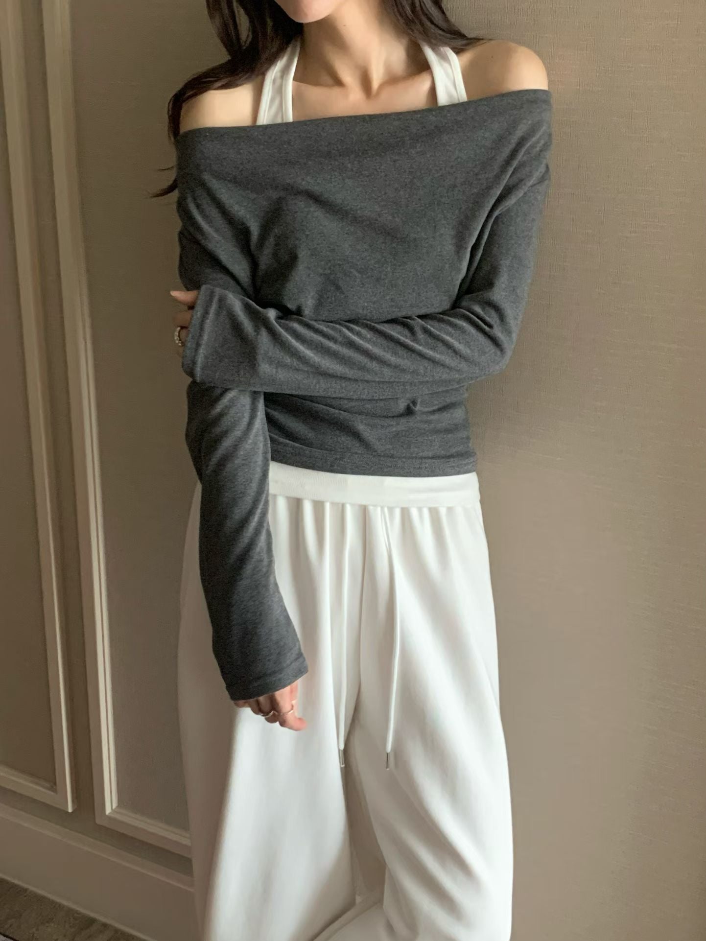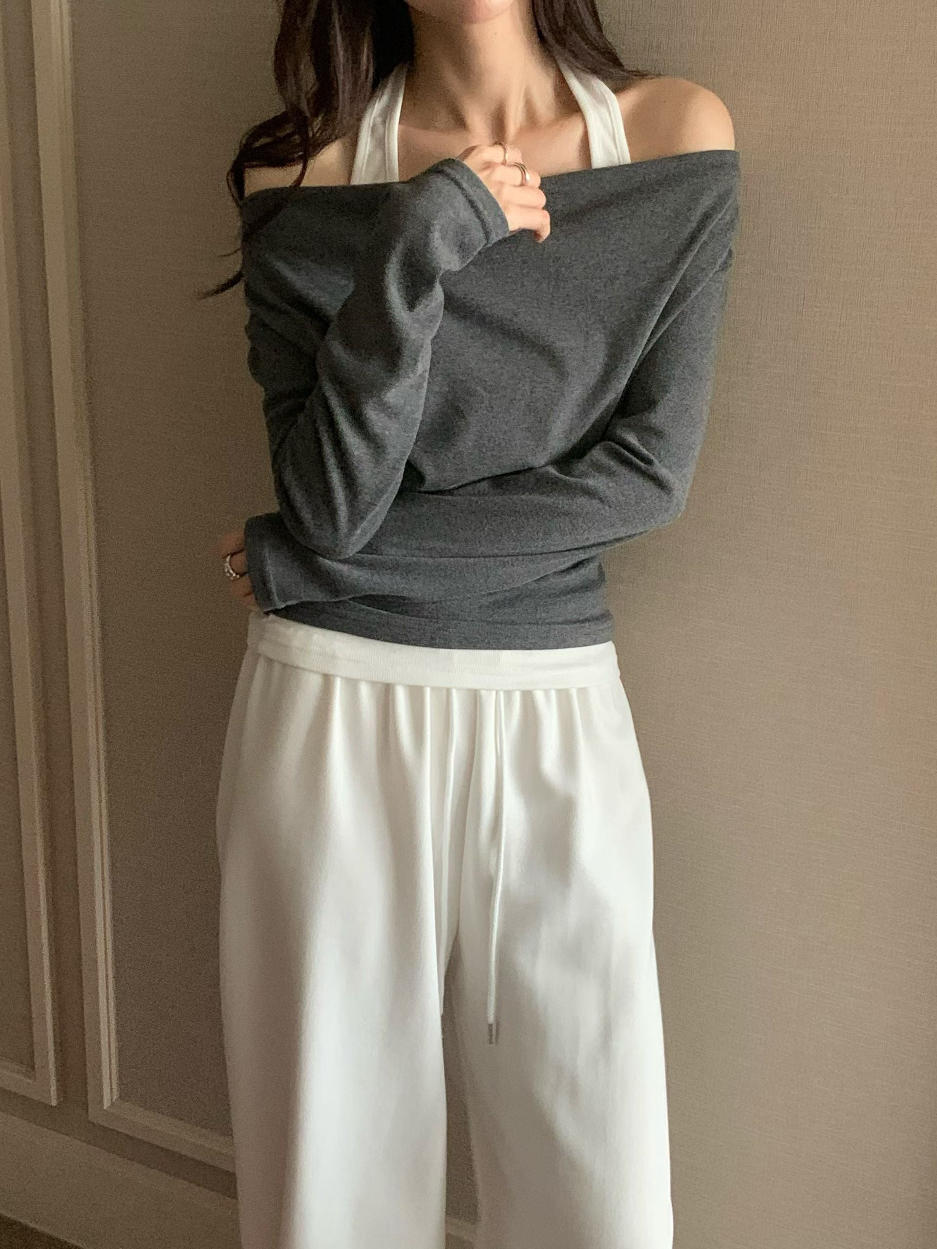 柔軟彈性假兩件掛頸top *共3色